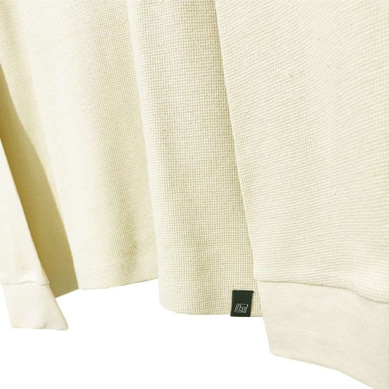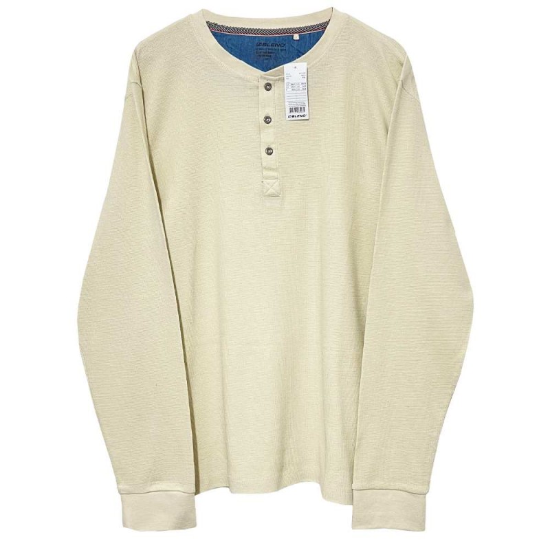 این تیشرت آستین بلند کرم رنگ وارداتی از برند BLEND بشکل تیشرت آستین بلند یقه گرد از جنس پارچه نخ پنبه و پارچه بیسکوئیتی است به همراه دکمه در یقه و با مچ کشبافت تولید و ارائه شده در قسمت پائین تیشرت از کشبافت استفاده نشده و برای آندسته از سلایقی که به داشتن مچ کشبافت در عین حال آزاد بودن تیشرت در قسمت پایین اهیمیت میدهند مناسب میباشد. الگوی بافت خاص پارچه با داشتن طرح با تنفس پذیری بالا در کنار غالب بودن جنس نخ پنبه تتفس پذیری این تیشرت را به عنوان یک تیشرت آستین بلند کرمی تابستانه و مناسب استفاده در ایام گرم سال بالا برده است.