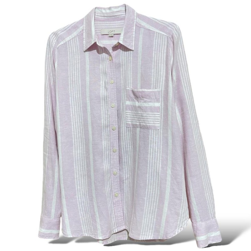 شومیز زنانه وارداتی از برند LOFT با طرح راهراه یاسی کمرنگ. قواره معمولی، پارچه لینن طبیعی، خنک و تنفسپذیر، بدون آبرفت و رنگرفت؛ مناسب فصل گرم.
