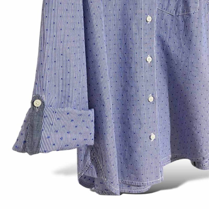 شومیز راهراه آبی وارداتی از برند Tommy Hilfiger با خالهای ریز روی خطوط، قواره نرمال و فیت. پارچه نخ طبیعی، خنک و بدون آبرفت با امکان تا زدن آستین و فیکس شدن با دکمه.