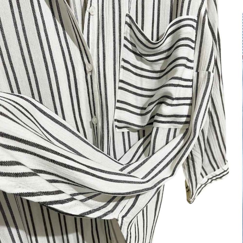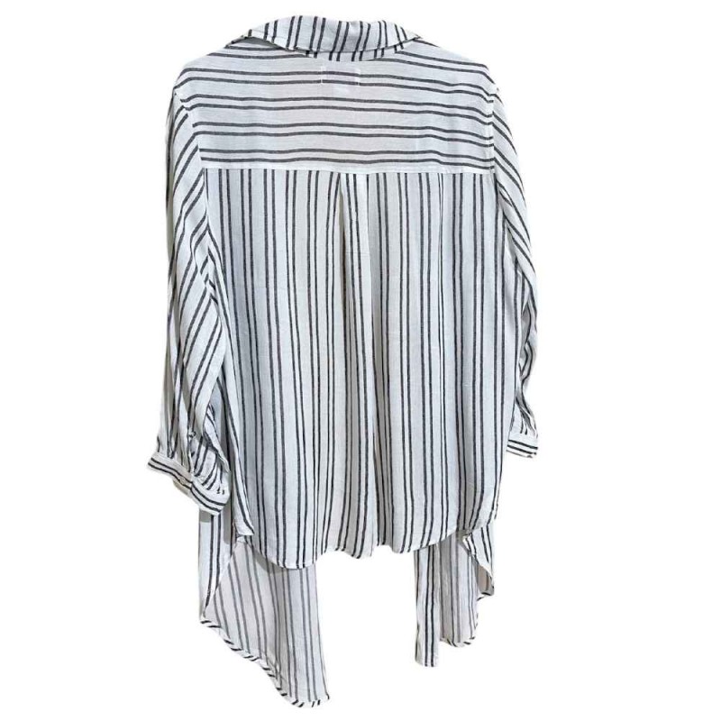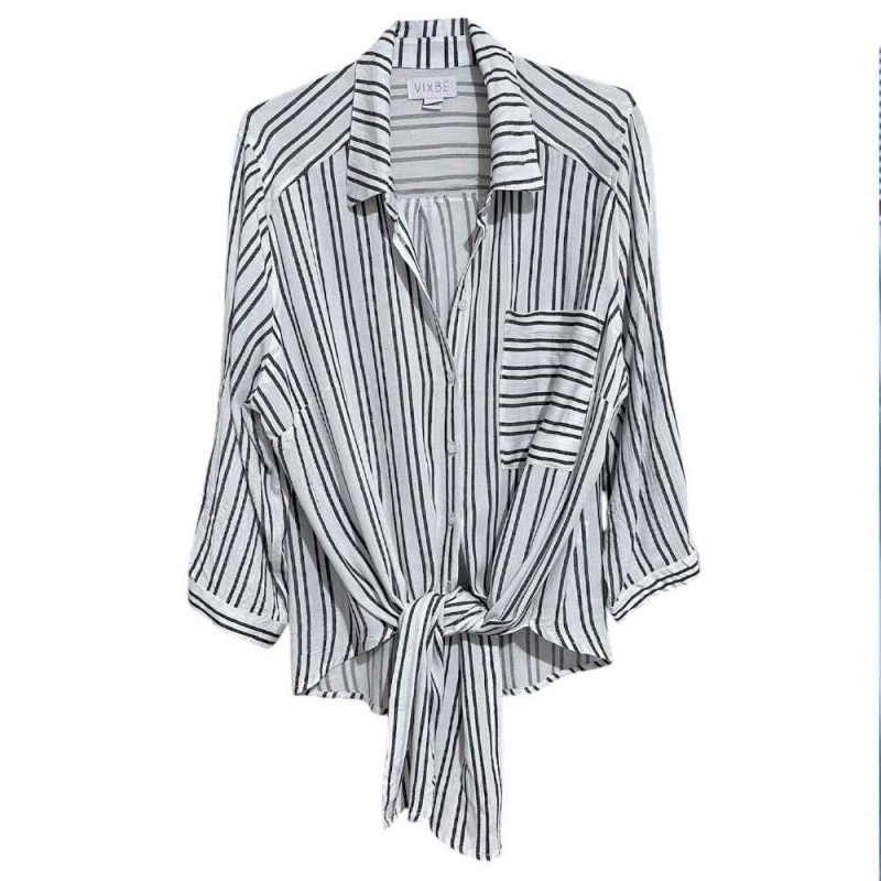 شومیز زنانه وارداتی از برند Vixbe با طرح مشکی سفید و استایل جلو گرهای. آستین سهربع، قواره آزاد، پارچه نخ پنبه طبیعی نرم و لخت، خنک و مناسب فصل گرم.
