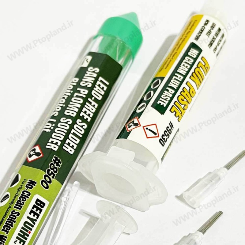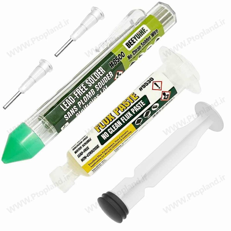 مجموعه سیم قلع 99.3% قلع + 0.7% مس به همراه خمیر فلکس سرنگی مدل 9530 از برند BEEYUIHF. بدون سرب، بدون نیاز به تمیزکاری، مناسب تعمیرات موبایل، BGA، SMT و پروژههای الکترونیکی دقیق.