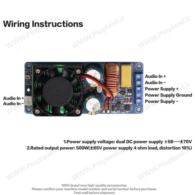 ماژول آمپلی فایر 500 وات مونو HI-FI کلاس D با عملکرد بهینه و راندمان بالا، دارای تقویت ولتاژ 36 برابر و مناسب برای بلندگوهای 10-18 اینچی با امپدانس 4 تا 8 اهم.