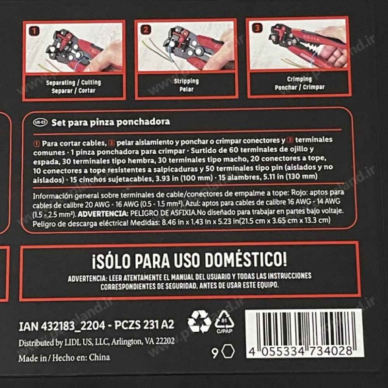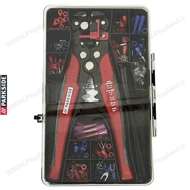 سیم لخت کن اتوماتیک و سیم چین پارکساید آلمان برای برش، لخت کردن و پرس سر سیم و کابل شو. شامل یک دستگاه و جعبه اورگانایزر با 14 خانه برای نگهداری انواع سر سیم و وایر شو.