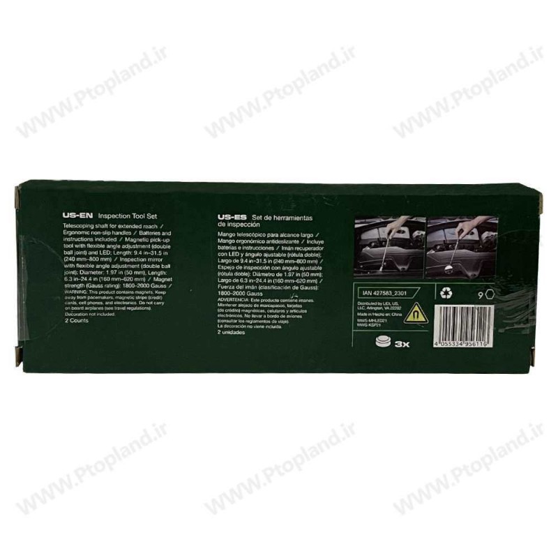 آینه بازرسی این ست نیز بهطور مشابه با طولی بین 160 میلیمتر تا 620 میلیمتر قابل تنظیم است، که بهراحتی به شما امکان میدهد تا از زوایای مختلف در فضای محدود به بررسی و بازرسی پرداخته و اشیاء پنهان یا دور از دسترس را پیدا کنید.