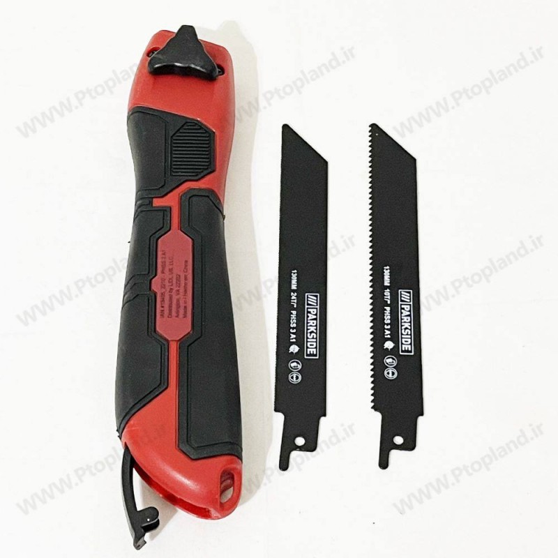 این اره دستی حاوی دو عدد تیغ اره که در داخل دسته قرار گرفته می باشد و برای استفاده کافیست ضامن مشکی رنگ در انتهای دسته را باز کرده و تیغ اره مد نظرمان را از داخل دسته خارج کنیم و آنرا در طرف دیگر دسته بین دو فلز محکم کننده قرار دهیم قبل از قرار دادن تیغ اره در طرف دیگر دسته می بایست مهره محکم کننده را کامل از جای خود باز کنیم چرا که مهره از محل سوراغ تیغ عبور کرده و با چرخاندن مهره تیغ بشکل بسیار مطمئنی در محل خود محکم میشود. عبور مهره از سوراغ تیغ باعث میشود به هیچ عنوان حتی در صورت شل شدن میکانیزم محکم کننده, تیغ از جای خود خارج نشود.